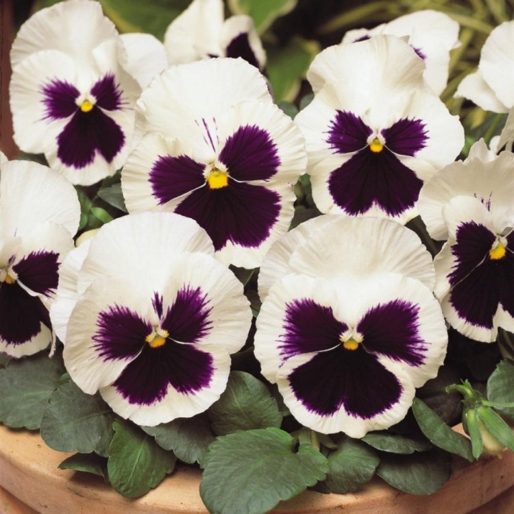 Семена анютиных глазок сорта Сильвербрайд позволят вырастить крупные цветы, относящиеся к группе Швейцарских гигантов. Эти экземпляры имеют интересную окраску: все лепестки белоснежные, а на нижних имеются темно-фиолетовые пятна. Начинающие садоводы оценят положительные качества рассады анютиных глазок: