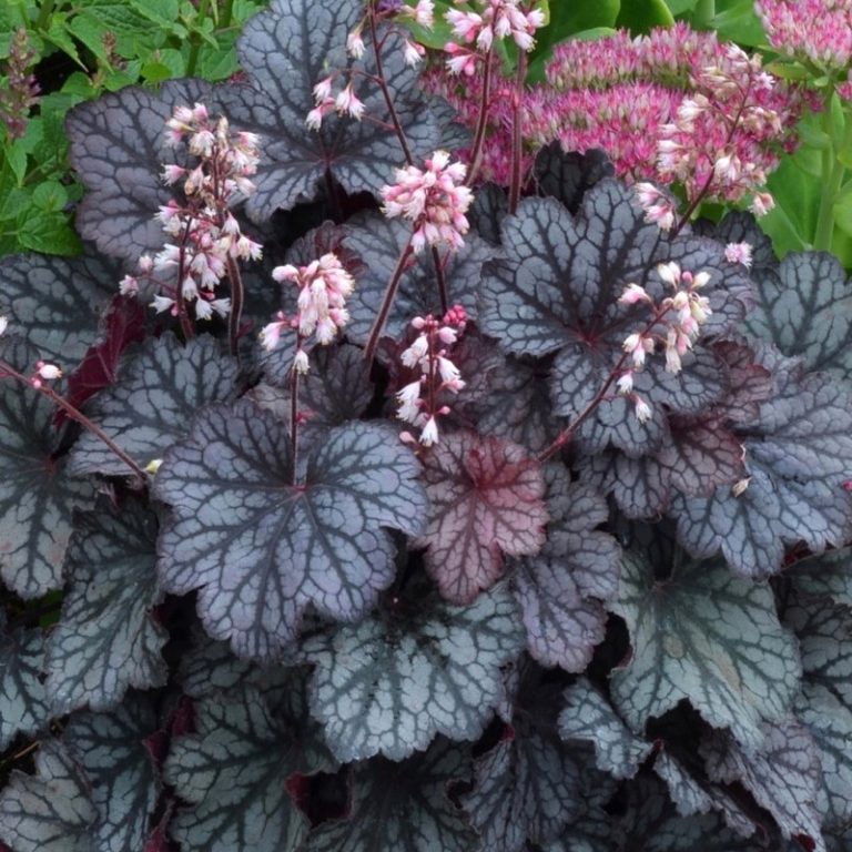 Рассада гейхереллы Твайлайт (Twilight) украсит ваш сад крупными угольно-пепельными листьями с серебристым налетом. Этот сорт отлично сочетается с другими декоративными растениями, поэтому широко применяется в ландшафтном дизайне. Летом кусты расцветают и на них появляются длинные цветоносы с белыми соцветиями. Ухаживать за рассадой гейхереллы Твайлайт (Twilight) несложно, нужно лишь регулярно поливать кусты, не допуская при этом переувлажнения и скопления застойной воды. Этот многолетник не боится болезней и вредителей, а также не нуждается в создании укрытия на зиму.