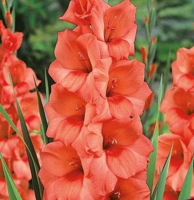 Высота взрослого гладиолуса – до 140 сантиметров. Листья длинные, жесткие, насыщенного зеленого цвета. Соцветия – плотные, состоят из 8-10 цветков яркого розово-лососевого колера. Период цветения – июль- август.