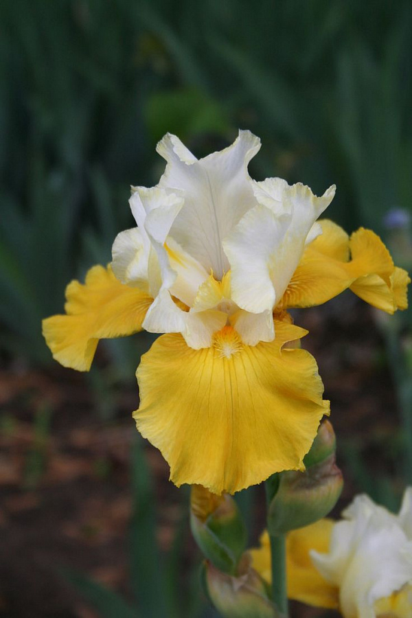 Период цветения ириса Бейберри Кэндл начинается в конце мая и длится до начала июля. На стебле появляются соцветия, лепестки которых отличаются по форме и размеру. Верхние нежно-желтые, собраны в пучок, а нижние — более крупные, одиночные, направлены книзу и окрашены в бронзовый оттенок. Этот сорт подойдет для выращивания на участке и для среза.