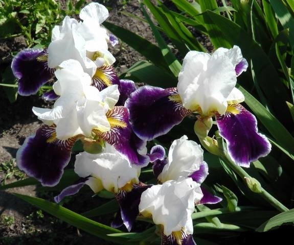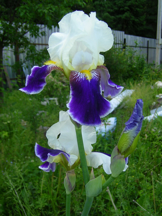 Стебли высокие, мясистые, мощные. Цветки двуцветные. Верхние доли белоснежные, подняты вверх, а нижние – насыщенного фиолетового цвета с кремовой каймой, изящно опущены вниз. Бородки лимонного оттенка. Бутоны сорта Вабаш распускаются одними из самых первых среди всех ирисов. Растение подходит на срез.