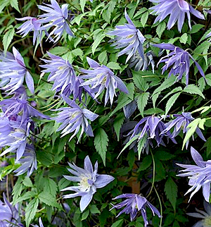 Саженцы Клематиса гибридного Lagoon (Clematis) является неприхотливым, весьма устойчивым к болезням и вредителям гибридом. Так как цветочные почки закладываются в прошлогодних побегах, растение почти не нужно обрезать. Лагун цветет с апреля по май месяц. В этот период растение покрывается маленьким полумахровыми цветками голубого цвета. Данный сорт лианы подойдет для декорирования заборов, оград или стен дома. Также, эффектно смотрится как солитер или в групповой посадке. Можно использовать как почвопокровное растение.