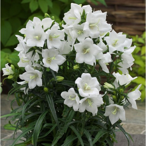 Рассада колокольчика Такион Уайт (Takion White) - это прекрасный сорт невысокого роста с чашевидными цветками белоснежного цвета. Цветы направлены вверх и наружу, в диаметре до 5 см. Высота растения: 60-80 см, а его ширина – 30-40 см. Цветение наступает уже в конце весны-начале лета. После обрезки наблюдается повторное цветение. Рассада колокольчика Такион Уайт растет в любой почве и лучше всего смотрится в альпинариях и цветниках. Идеально подходит для небольшого пространства, создания бордюра или контейнерного садика.