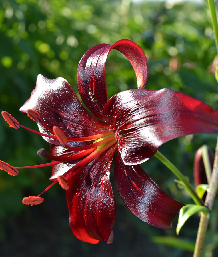 Луковицы лилии азиатской Найт Флайер (Night Flyer) входят в группу «тигровых сортов» азиатских гибридов. Это изящное растение, поражающее утонченной красотой. На высоком стебле распускается до 4 крупных чалмовидных цветков на тонких цветоносах. Их загнутые блестящие лепестки окрашены в насыщенный черно-бордовый цвет. Ближе к центру бутона видны черные вкрапления, похожие на маковые зерна.