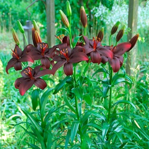 Луковицы Лилии азиатской Ройал Кисс (Lilium asiatic Royal Kiss) потрясают воображение необычными оттенками распустившихся цветков. На плотном, крепком стебле высотой до метра распускаются крупные цветки с насыщенно-винным цветом. На лепестках отчетливо видно бордовое напыление, оттеняющее более нежный основной оттенок.
