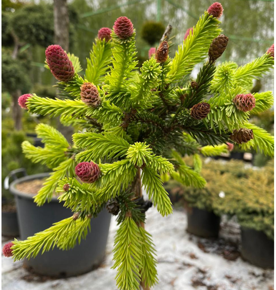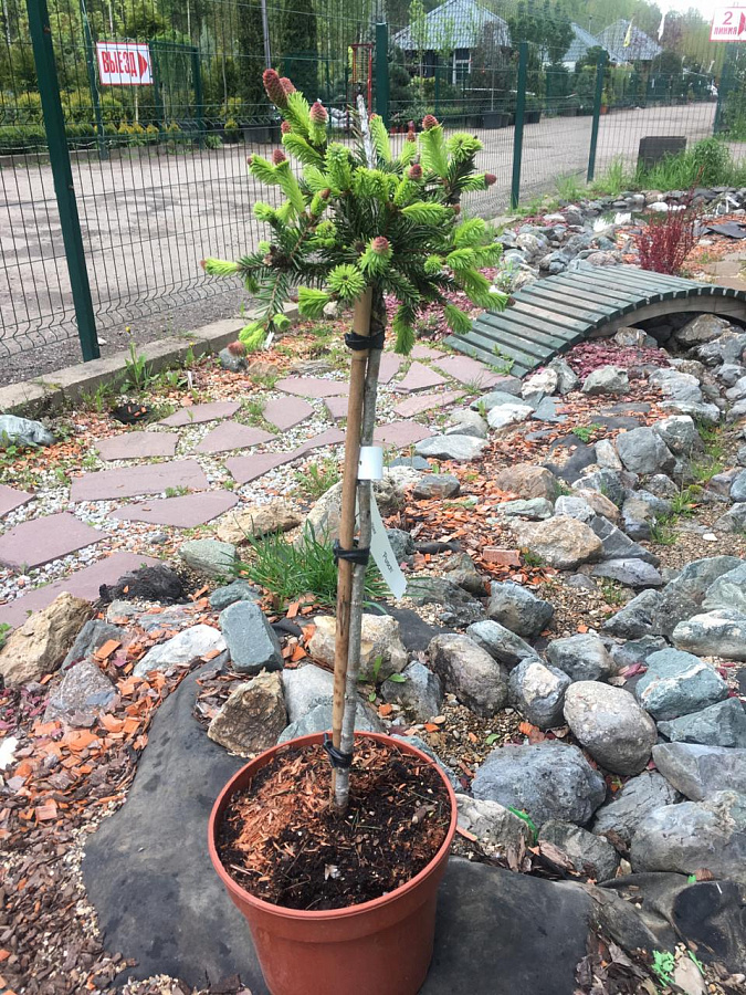 Саженцы Ели обыкновенной Акрокона Пуш на штамбе (Acrocona Push) – это малогабаритная форма вида ели Акрокона. Дерево имеет неравномерную, густую, шарообразную крону, со свисающими ветками и короткой зеленой хвоей. Ель растет медленно и в первые 10 лет ее высота составляет 30 сантиметров, а диаметр 60 сантиметров. Ель обыкновенной Акрокона Пуш на штамбе отличается красивыми шишками, которые в период распускания имеют нежно-розовый или красно-фиолетовый цвета. Эти шишки маленькие и появляются на отростках текущего и прошлого года. Ель используется для альпинариев, рокариев и низкорослых хвойных групп.