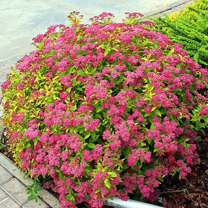 Саженцы японской спиреи Антони Ватерер (Anthony Waterer) порадуют садоводов яркими соцветиями, которые контрастно выделяются на фоне темной сочной листвы. Этот пышный кустарник отлично сочетается с более высокими растениями и гармонично впишется в группу себе подобных представителей флоры. Особенности крупномера: листва – длинные плотные листья, заостренные на конце, темно-зеленого цвета; диаметр соцветий – до 15 см; цветы – маленькие малиновые с фиолетовым оттенком. Саженцы спиреи Антони Ватерер не требуют сложного ухода, но для хорошего развития необходимо периодически производить обрезку старых побегов.